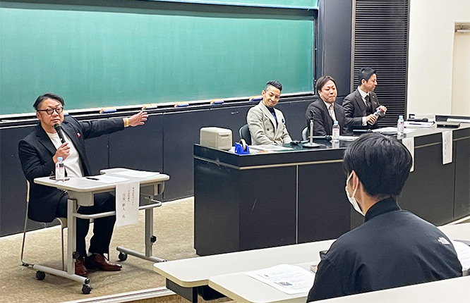 | パネリスト | 島田 雄太 氏 (リアライ社会保険労務士法人 代表、2003年 経済学部 卒業) 森 和樹 氏 (株式会社ヴァルト 代表取締役、2010年 国際学部 卒業) 林 英樹 氏 (林英樹司法書士事務所 代表、2009年 法学部 卒業) |
