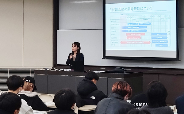 前半の合同ゼミナールでは、キャリアセンタースタッフによるガイダンス「就職活動の第一歩」で就職に向けた今後の過ごし方を確認した後、「就職活動の基礎」となる学力、文章力、コミュニケーション力に関するワークを行いました。