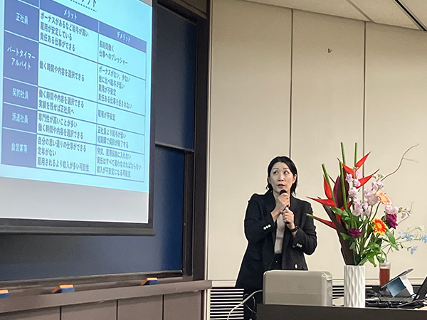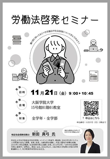 当日は吹田市地域経済振興室のご協力のもと、社会保険労務士 新田真弓先生からアルバイトや就職のときに知っておくべき知識をご講演頂きました。セミナーには多くの学生が集まり、今後の労働についての様々な有益な情報に耳を傾けていました。