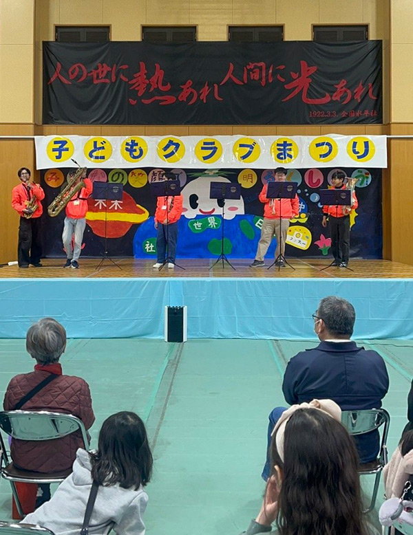 吹奏楽部が「こどもクラブまつり2026」に協力しました 2026年04月15日 吹田市の青少年クリエイティブセンター主催の「こどもクラブまつり2026」において、吹奏楽部が運営及び演奏で協力しました。〔2026年3月22日(日)〕 本イベントは小・中学生が中心となって企画・準備・運営を行うもので、本学吹奏楽部員は本年2月から週1回のペースで企画立案から全面的にサポートにあたりました。 当日は運営補助に加え、来場者向けに楽器紹介を兼ねた演奏を行い、こどもたちとともに会場を盛り上げました。