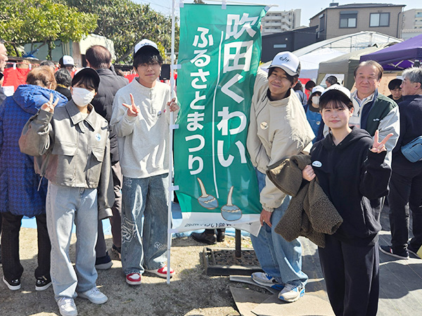 吹田くわいふるさと祭り2026参加報告 2026年03月03日 平野ファーム(吹田市江坂町)で開催された「吹田くわいふるさと祭り2026」にボランティア部が協力しました。〔2026年3月1日(日)〕(参加者:4名) 今年で4回目となるこの祭りでは、吹田くわいの販売や、吹田くわいを使用したさまざまな料理の提供が行われ、地域住民が多く来場し、会場は大いに賑わいました。 ボランティア部の学生は、来場者と積極的に交流しながら、誘導や会場の設営、くわい入りの餅つきを行うなど、吹田くわいの魅力発信に協力しました。
