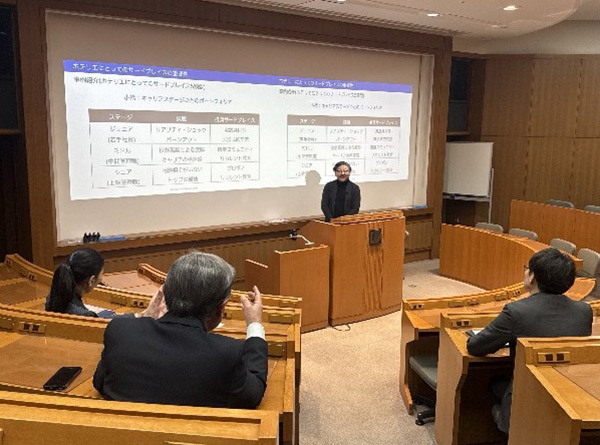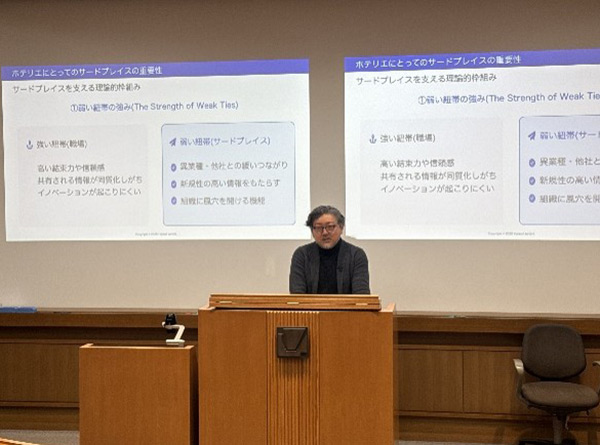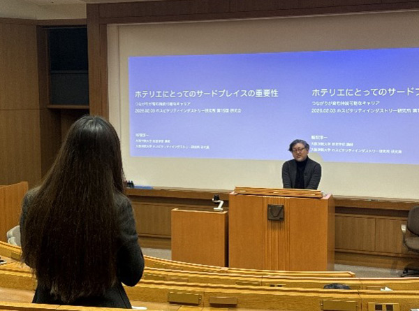 今回の研究会では、本学経営学部講師の服部 淳一 先生より『ホテリエにとってのサードプレイスの重要性~「つながり」が育む持続可能なキャリア~』をテーマに、ホテルでの実務経験を通して感じたホテルビジネスやホテリエの課題から、持続可能なキャリアを形成する「つながり」を育むための「サードプレイス」の重要性について、理論的枠組みや事例紹介・今後の課題を交えて解説していただきました。