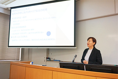 第一部では、後藤晃範教育開発支援センター副所長より甲南女子大学で実践されているLA(Learning Assistant)制度の紹介があり、上級生が下級生を支援する学びの仕組みが紹介されました。続いて中則夫先生からは、国際学部における「振り返り」を重視した授業実践が、学生の意識変化につながった事例が報告されました。短期大学部からは、石田知子非常勤講師と2年次生2名が登壇し、学内インターンシップを通じて学生が成長し、自信や自己肯定感を高めていった様子を紹介しました。
