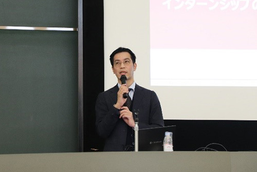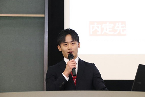 就職講演では、株式会社マイナビより坂田 隆 様を講師としてお迎えし、「最新の就職環境とインターンシップの活用方法について」をテーマにお話しいただきました。また、講演後には就職内定者の4年次生2名による活動報告を行いました。