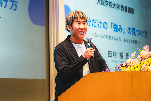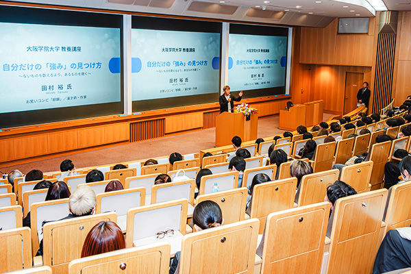 本学学生・教職員や一般の方々が参加し、地元・吹田市出身である田村氏の登壇に、会場は終始和やかさと熱気に包まれました。