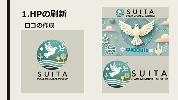 2025年4月、吹田市役所ホームページの「吹田市立平和祈念資料館」ページが、「大梨」チームの提案を反映しリニューアルされました。ロゴを配置し、レイアウトを整理することにより、メニューがわかりやすくなりました。また、「平和クイズ」、「平和クロスワード」の設置など、若い世代にも親しみやすいデザインへと生まれ変わりました。