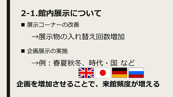 吹田市立平和祈念資料館は戦争の記憶を伝える大切な場所ですが、若い人がなかなか来てくれないという課題を抱えていました。「大梨」チームはまず、資料館の来館者の利用実態を調べ、情報発信の方法と展示の見せ方を工夫すれば、もっと良くなりそうだと考えました。