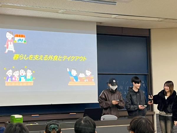 第1グループは外食産業をテーマに選び、独自アンケートを実施して外食頻度や外食を控える理由等を調査した。その結果、外食を控える主な理由は「健康志向」「価格が高い」「店舗が近くにない」の3点であった。外食利用が相対的に少ない高齢者層と、今後増加が見込まれる訪日・定住外国人をターゲットに設定し、(1)地方在住で移動手段が限られる高齢者向けに健康的で比較的低価格な宅配弁当、(2)外国人向けに多言語対応の体験型日本食レストラン、の2つのビジネスを提案した。