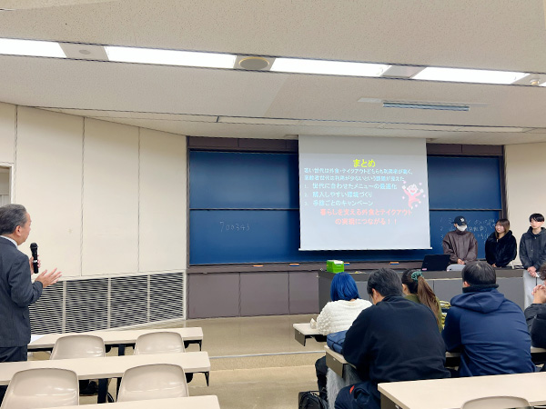 いずれのグループの発表も力作であった。ネット検索による表面的な調査にとどまらず、チラシや動画を制作し、アンケート等による検証を行い、その結果を踏まえて課題解決の糸口を見いだそうとしていた点が特に印象的である。仕事においても日常生活においても、課題を発見し、取り組み、検証し、新たな課題を見いだすというプロセスの繰り返しが成長につながる。今後もさまざまな活動を企画し、参加し、試行し、次につなげていってほしい。