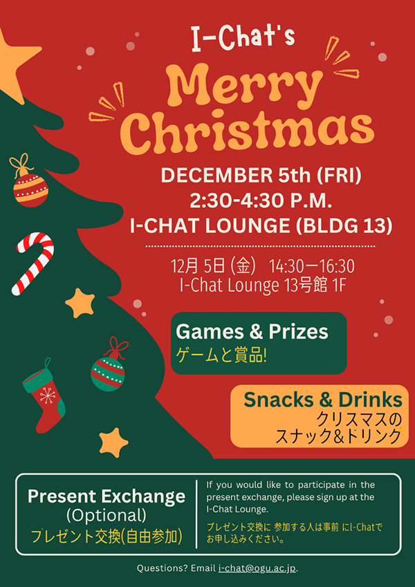 今年もクリスマスの時期がやってきました。今年のI-Chat Loungeのクリスマスイベントは12月5日14;30から16;30まで開催します。クリスマスに関するゲームで賞品をゲットしましょう。希望者はプレゼント交換ゲームにも参加できます。詳細はI-Chat Loungeまで!是非お友達と一緒に参加してください!